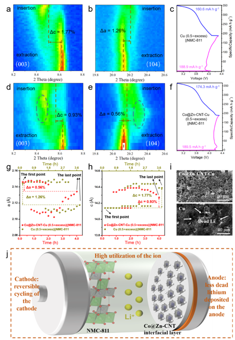 Prof. Yue Ma group (School of Materials Science and Engineering, Northwestern Polytechnical University) recently published a paper entitled “Molten-Li Infusion of Ultra-Thin Interfacial Modification Layer towards the Highly-Reversible, Energy-Dense Metallic Batteries” on Energy Storage Materials (2022) 45: 796-804. In this research, they proposed an ultra-thin interfacial composite layer derived from the core-shell MOF precursor to furnish the Cu foil. The in-situ grown CNTs threaded from the interior Co-centers could enhance the structural robustness of the dodecahedron storage units in the interfacial layer; while the atomically dispersed Zn species riveted on the exterior could absorb the Li ions as the “magnet” for the controlled molten-Li infusion. the as-constructed single-layer pouch cell realized the simultaneous high energy density and cycling endurance at the extreme rates. With further real-time phasic monitor and post-mortem morphological evaluation of the full cell model, the reversible dynamic lattice breathing of the NMC-811 cathode as well as the restrained dendrite growth of the anode substrate could be observed, as showed in Figure 1.