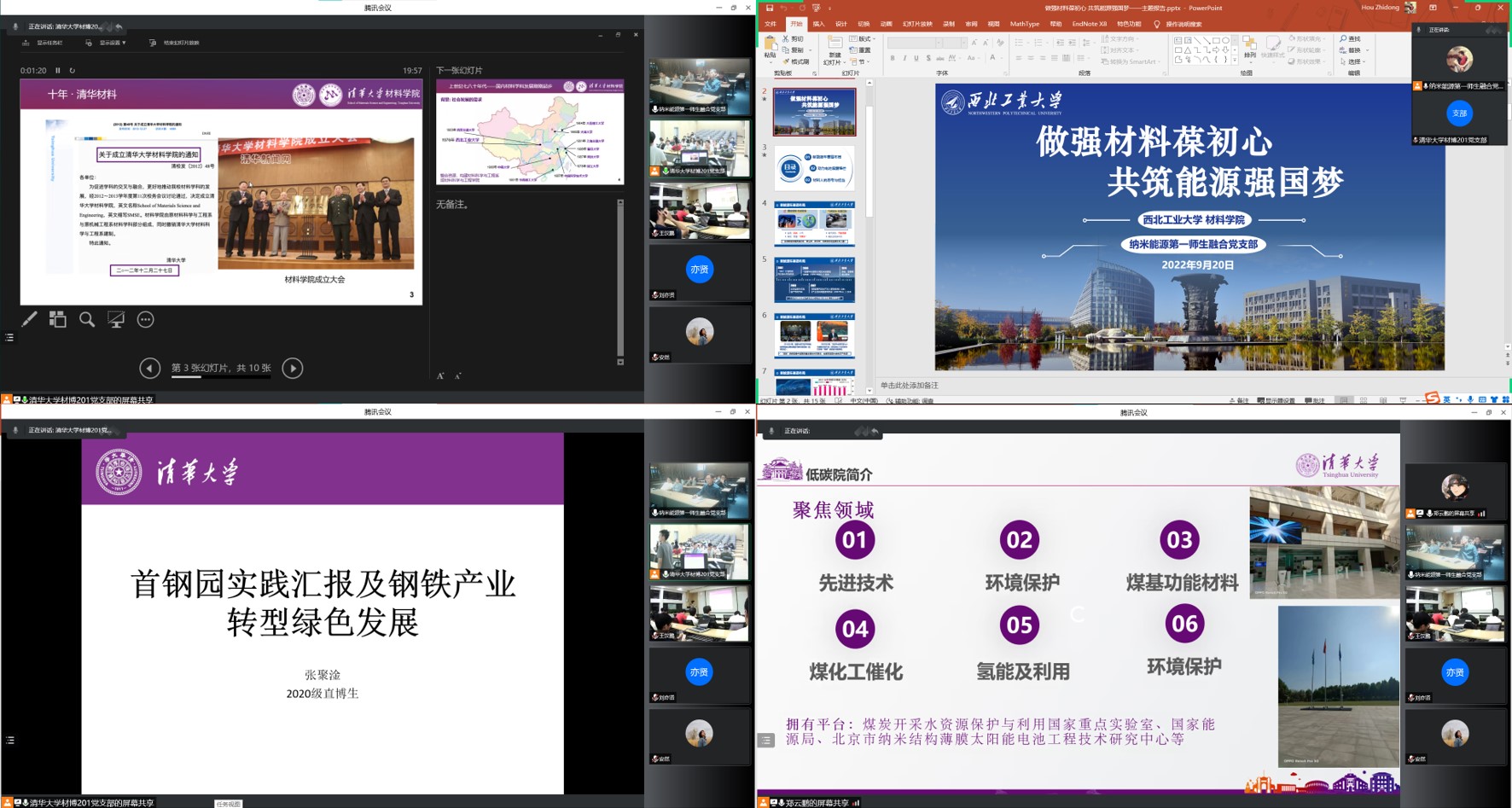 随后,西工大2021级博士生侯志栋、清华大学2020级博士生张聚淦和刘佳宁三位同学分别做了题为《做强材料葆初心,共筑能源强国梦》、《首钢园实践汇报及钢铁产业转型绿色发展的思考》和《低碳清洁能源研究院实践汇报及清洁能源绿色转化的思考》的主题报告,三位同学从各自研究领域的时代背景出发,通过调研和实践等方式,聚焦能源低碳清洁发展,分享了我国新能源汽车的发展概述、钢铁产业转型绿色发展以及清洁能源绿色转化产业现状,紧扣努力实现“双碳”目标的发展主题,号召新时代的材料人,扛起实现能源强国的时代重任。