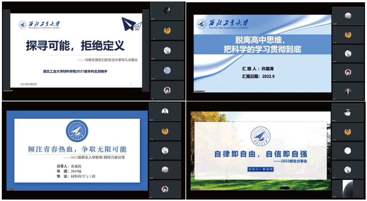 紧接着,2021级刘驰宇、靳采祥,2020级许晨涛和2019级黄俊诚四位同学分别做了题为《探寻可能,拒绝定义》、《脱离高中思维,把科学的学习贯彻到底》、《倾注青春热血,争取无限可能》和《自律即自由,自信即自强》的专题报告,四位同学通过总结个人经验,从专业科学研究与思维养成的角度,分享了大学学习、科研探索以及健康生活方面的经验,并表示只有通过不懈的努力过好大学生活,才能争取属于自己的美好未来。