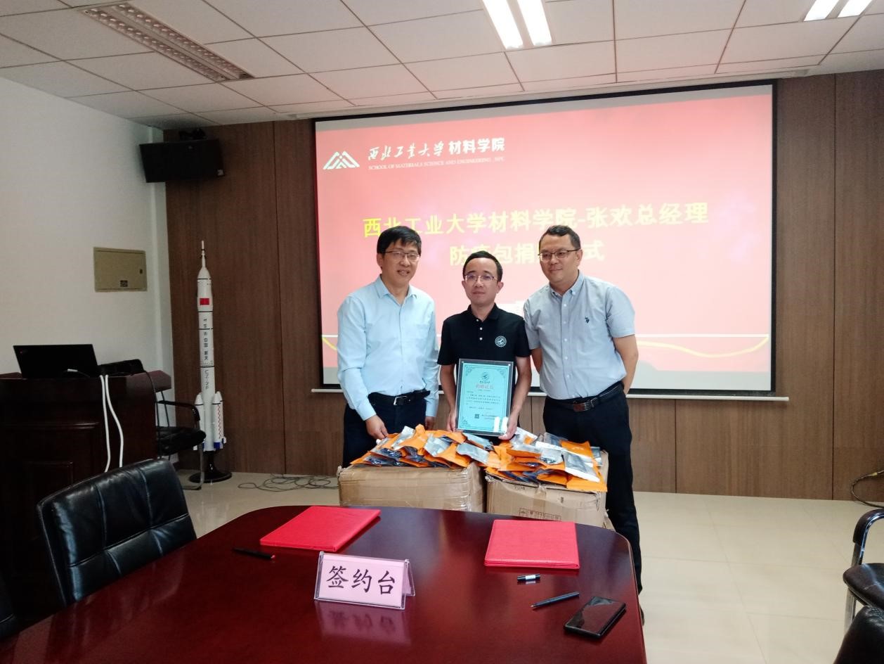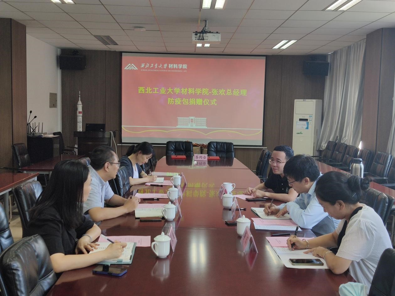 与中陕核生态环境江苏分公司张欢总经理在公字楼322会议室顺利举行了防疫包捐赠仪式。学校教育基金会秘书长张英群、换妻
