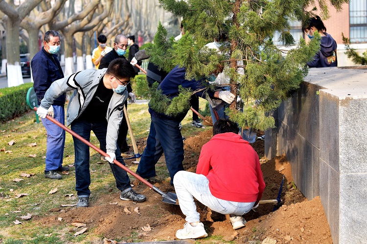 11日上午八点大家在国际会议中心集合,大家带着满腔的热情分组分工,现场气氛非常热烈,大家手持铁锹,干劲十足。老师带头,与学生党员一起齐心协力共同种植,在公字楼旁种下希望之树。