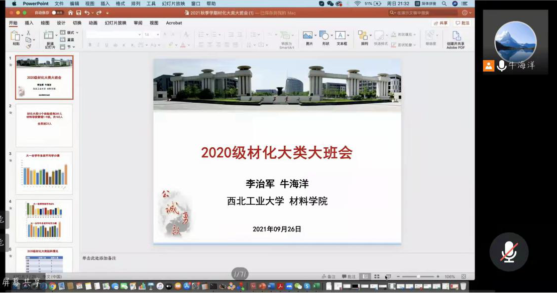 为了对2020级材料与化工大类学生进行国庆节假期安全教育、第一学年学习工作总结,2020级一、二大班于2021年9月26日通过线上会议的形式召开会议,由辅导员牛海洋、李治军老师主持会议。