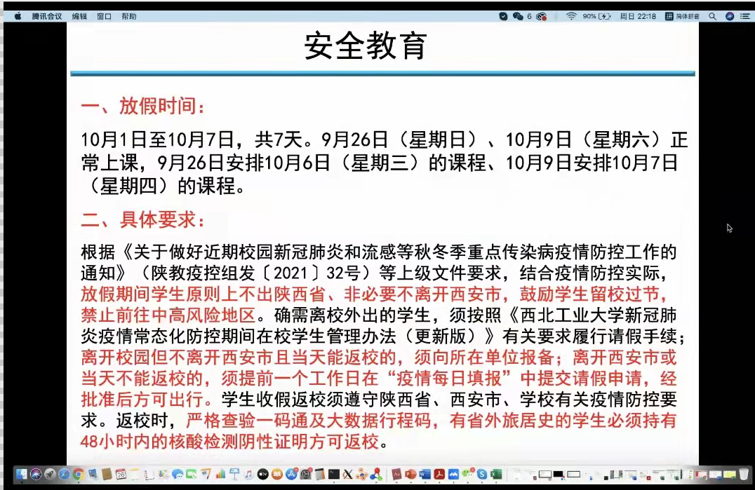会议第二部分由李治军老师对全体同学进行思想教育和国庆假期期间安全教育,老师要求严格执行国家及学校有关防疫措施,必须落实疫情每日填报制度,同时应提前在“疫情每日填报”系统提交请假申请,严格执行学院请假制度。