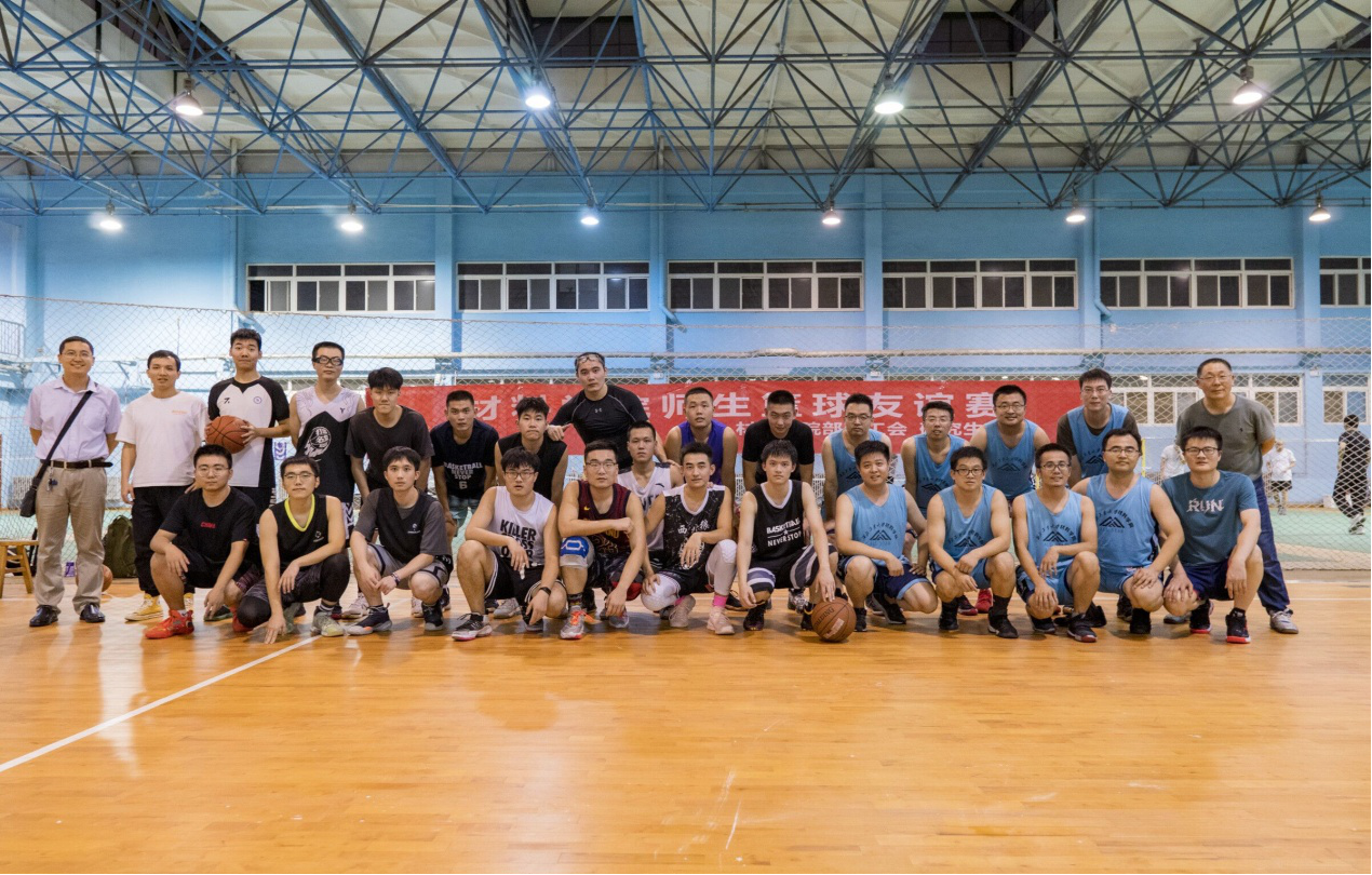 师生篮球友谊赛在学校西苑体育馆拉开了序幕,学院部门工会主席杨舜、副主席张勇参加开幕式并观看比赛。