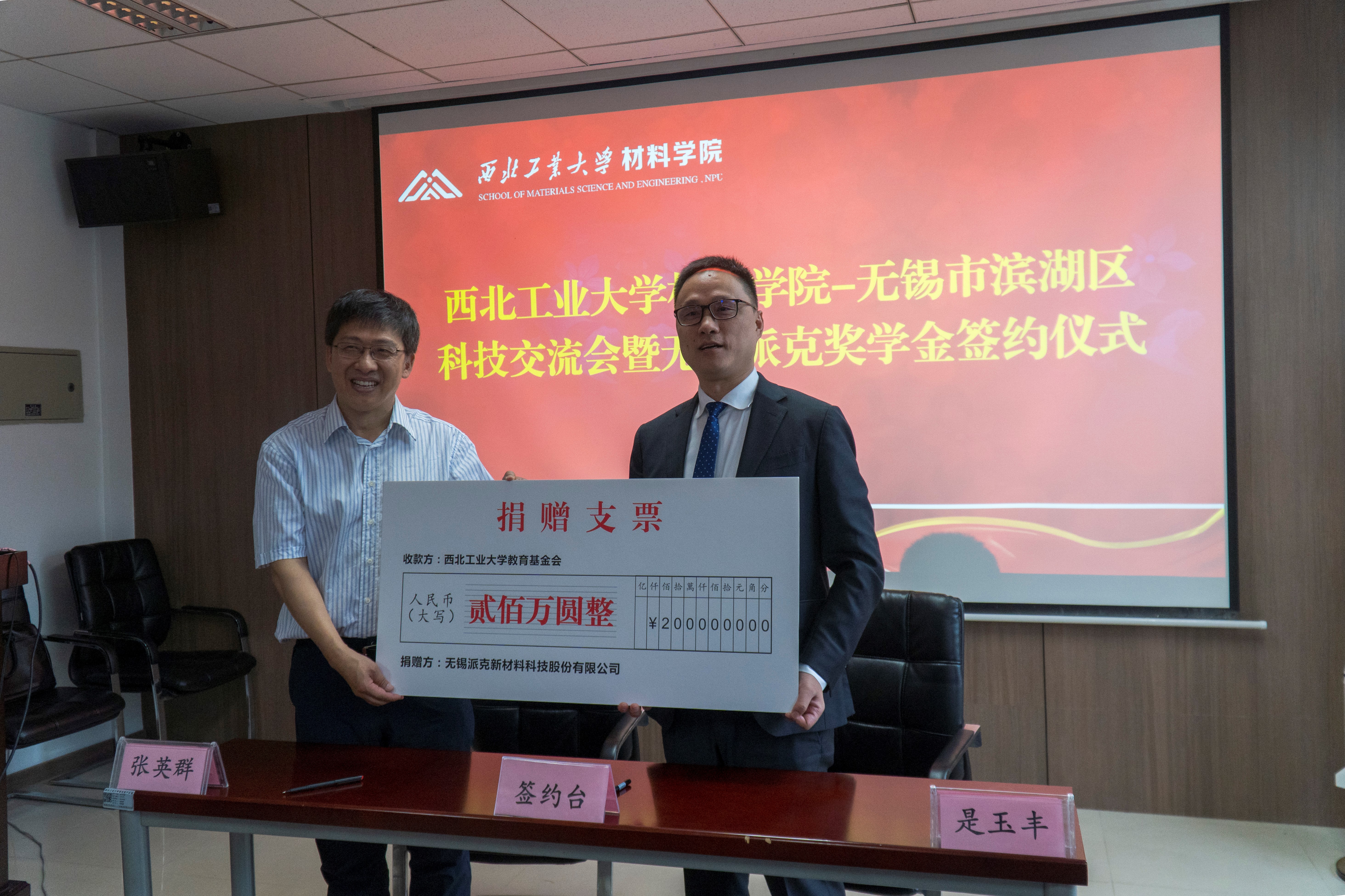 教育基金会秘书长张英群与无锡派克新材料科股份有限公司董事长是玉丰签订了捐赠协议,并设立“无锡派克奖助金”共计200万元,用于重点奖励材料学科的优秀全日制在读本科生、研究生。是玉丰董事长表示热烈欢迎换妻