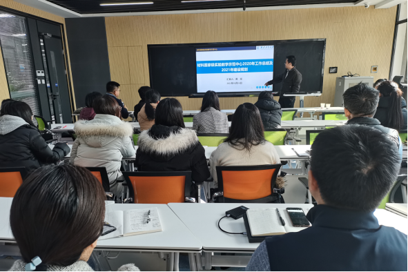在随后的中心2020年终总结大会上,中心主任傅茂森、副主任黄斌分别对中心2020年度整体工作和实验教学工作进行了总结和汇报。傅茂森主任分别从疫情防控期间复工复产、中心教学场地改造、仪器设备建设及安全管理、人员队伍建设及人才培养、开放共享情况、对外合作交流等几个部分进行总结汇报,并对2021年度的重点工作计划进行总体计划安排。黄斌副主任分别从材料国家级实验教学示范中心的建设思路、中心建设及创新基地建设情况、人才培养体系、课程建设体系、学科技能竞赛等方面对2020年度工作进行了总结汇报,并传达了学院在实验教学工作中的顶层设计及未来三年规划方向,对中心2021年度实验教学方面的建设规划进行了介绍。