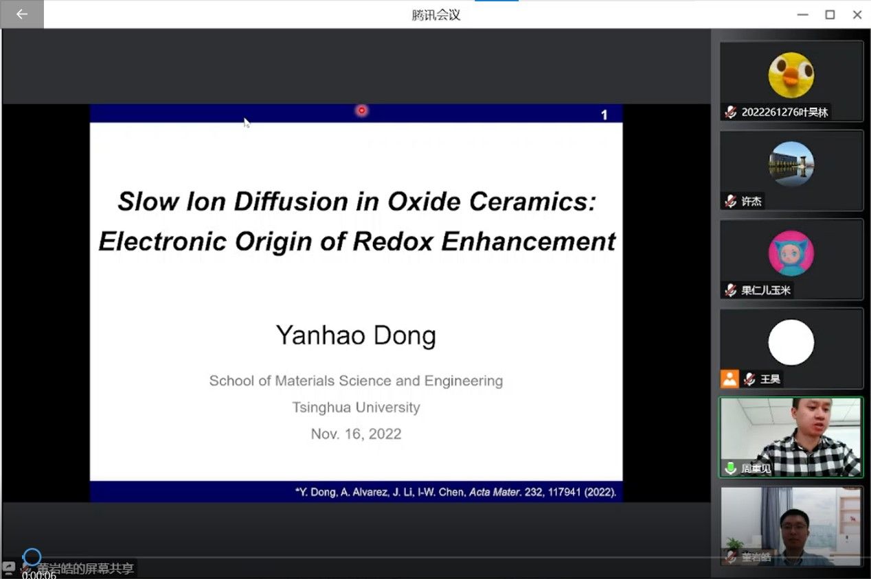 报告会开始,周重见对本次报告主题及主讲人进行了简要介绍,随后由董岩皓开始主题为“Slow Ion Diffusion in Oxide Ceramics:Electronic Origin of Redox Enhancement”的讲座。首先,董岩皓教授从固体电子学、离子学和和陶瓷材料大致研究内容切入,直接地提出讲座的核心:陶瓷材料的慢离子动力学。通过列举(1)CeO2添加Gd,Ce4+在H2气氛下还原为Ce3+,其晶体长大速度400倍(2)ZrO2在H2气氛下晶体长大速度变换不明显,而在电环境下阴极晶体生长速度增快,阳极减慢,大小晶粒之间有明显界面,形成PN结(2)H2气氛下热处理,Ce掺杂ZrO2晶体尺寸变大,第二相颗粒没有很好的钉扎晶界,而在空气中热处理出现晶粒细化。三个例子,总结了ZrO2 、CeO2、CaTiO3钙钛矿结构高价态阳离子是决定传质过程和显微结构氧化的慢离子,提出相应还原低价态阳离子其传质过程明显高于高价态的问题,并以此展开研究。接下来,通过三价Y离子类比四价Zr离子,提出离子d轨道电子差异对传质影响。进一步通过缺陷浓度理论、能垒计算等理论,提出低价态离子d轨道存在电子,局部原子配位环境变化影响能级变换,同时Jahn-Teller效应降低体系能量保持电子结构稳定的解释。同时将类似研究应用于CaTiO3钙钛矿结构材料进行研究。最后,董岩皓总结(1)还原额外电子和氧化空穴激活Jahn-Teller效应和电子弛豫过程对慢离子动力学有很大影响。(2)提出半导体材料、陶瓷材料耦合的概念(3)离子半径对马鞍点结构没有影响。
