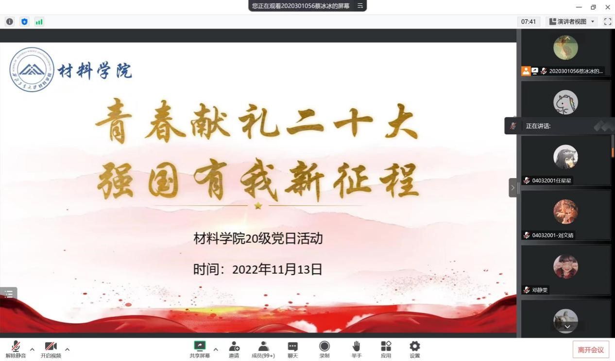 本科2020级党支部召开了“青春献礼二十大,强国有我新征程”党日活动,重点学习党的二十大精神。本次党日活动由蔡冰冰同学主持,王雅楠、张艺凡两位青年宣讲团讲师重点宣讲了党的二十大精神,随后2020级各班代表分享了党的二十大学习心得和感悟。本科生大类党支部书记王紫东、2020级全体预备党员、发展对象、积极分子线上参与本次活动。