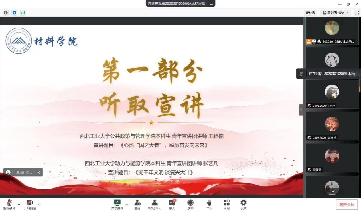 宣讲过后,韩显烨、刘苏瑶、田静若兰等11名同学分享了学习二十大精神心得,以及对新修订的党章的理解。在分享会阶段,同学们纷纷表示,作为西工大学子,应将党的二十大精神落到实处,努力学习,开拓进取,用知识武装自己,提高自身科研能力和实践能力;更应敢为人先,材料报国,成为不局限于纸面知识而是具有真正解决难题实力的人才,为国家的材料科学事业尽自己的一份力。