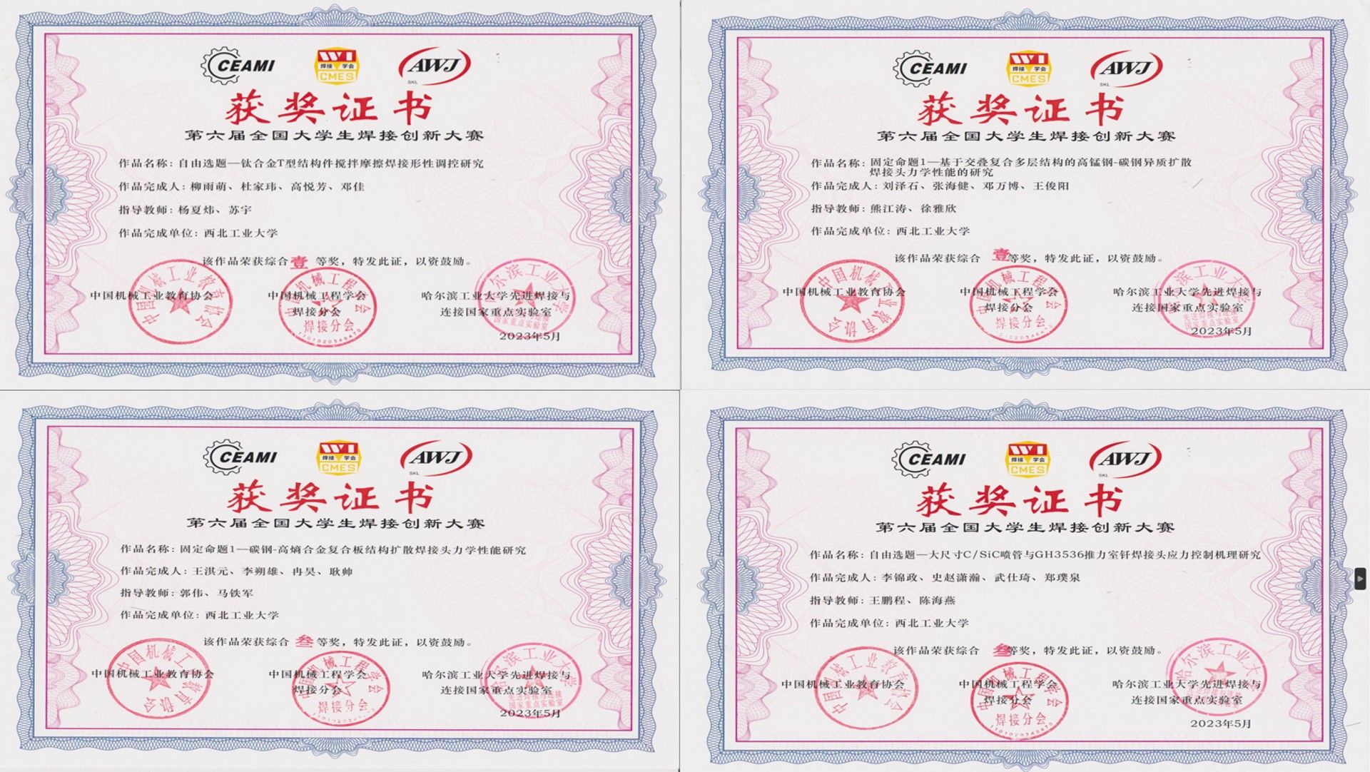 的大力支持下,经选拔,我校共组建4支代表队伍,由李文亚教授、杨夏炜副教授、郭伟教授带队参加决赛,李文亚教授与杨夏炜副教授分别担任了评审小组组长与组员。经过学生对创新作品的演示与答辩、评委的提问与讨论等多个环节,我校代表队最终获得一等奖2项、三等奖2项的优异成绩,充分展现了我校材料学子的专业素养、沉着自信和真材实料的精神风貌。其中,由杨夏炜副教授、苏宇博士后指导的作品《钛合金T型结构件搅拌摩擦焊接形性调控研究》,熊江涛教授、徐雅欣副教授指导的作品《基于交叠复合多层结构的高锰钢-碳钢异质扩散焊接头力学性能的研究》获得本次大赛一等奖。