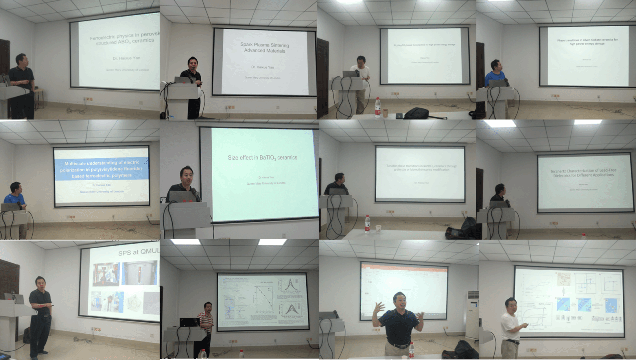 Haixue Yan副教授的讲座围绕铁电材料物理基础、钙钛矿结构和Aurivillius 结构铁电陶瓷材料、无铅压电陶瓷的相变和性能调控、放电等离子场辅助烧结技术在功能陶瓷领域的应用、BaTiO3陶瓷的晶粒尺寸效应、AgNbO3反铁电陶瓷、PVDF基铁电聚合物、(BaSr)TiO3介电可调功能陶瓷、铁电陶瓷THz介电性能、高熵介电功能陶瓷等方面进行展开,系统阐述了其课题组近20年的研究成果并对先进功能陶瓷材料的发展方向进行展望。讲座期间,Haixue Yan副教授回答了师生的提问,与大家就功能陶瓷的相结构调控、铁电材料极化机制、电畴结构转变等方面进行了深入的交流与探讨,使参会师生充分了解先进功能陶瓷材料的研究现状与最新发展动态。Haixue Yan副教授来我校访问期间,与换妻