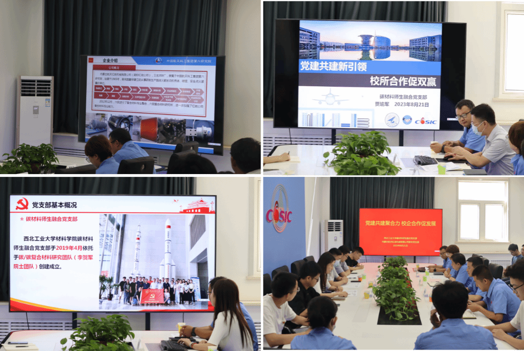 下午双方还开展学术交流,严科飞主任汇报了《发动机对新材料的需求》,碳材料师生融合党支部支委刘志强汇报了《反应熔渗-气相渗硅复合工艺制备基体/涂层一体化C/C-HfC-SiC复合材料的抗氧化烧蚀性能研究》,碳材料师生融合党支部学生代表郭凌翔汇报了《高超声速武器热端部件表面长寿命抗烧蚀高熵陶瓷涂层》,与会党员们分别从碳/碳高温复合材料的最新研究应用进展、共建“卡脖子”难题、推动“高校+企业”科研项目合作、弘扬航天精神、创新党建活动形式进行热烈讨论。双方在优势互补、目标趋同的背景下进行交流共建,共同推进共建科技创新平台、联合科技攻关、建设实习就业基地。
