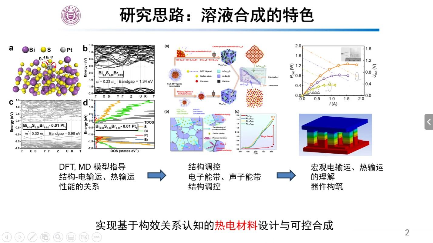随着全球工业化发展,人类正面临着严重的能源短缺和环境污染的问题。半导体热电材料可以实现热能与电能的直接转化,对于节能和环保具有重要的意义。本次报告着重于热电材料的溶液法合成与器件研究,将纳米科学与热电材料相结合,发展了一些新颖的提升热电优值的策略。徐骉教授使用元素掺杂的方式对纳米材料中的位错密度和晶粒尺寸进行调节,在降低了晶格热导率的同时提升了塞贝克系数,最终优化了材料的热电性能。此外,通过对纳米晶的形貌调控和介观组装构建了多孔热电材料,研究了材料的孔隙率对其热导率影响。最后,使用化学配体和Pt单原子对热电材料的表界面进行修饰,构建了亚纳米尺度的复合材料,极大地增强了材料内部的声子散射,实现了亚纳米尺度的材料性能调控。