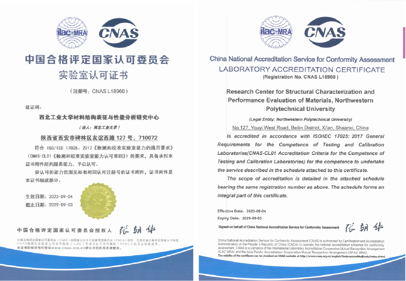 材料结构表征与性能分析研究中心(陕西省材料分析研究中心)正式通过中国合格评定国家认可委员会(CNAS)审核,并取得实验室认可证书(注册号:CNAS L18960),标志着中心已建立了符合国际标准的实验室管理体系,具备了按照国际认可准则开展项目检测的能力,可出具具有行业公信力的权威报告。
