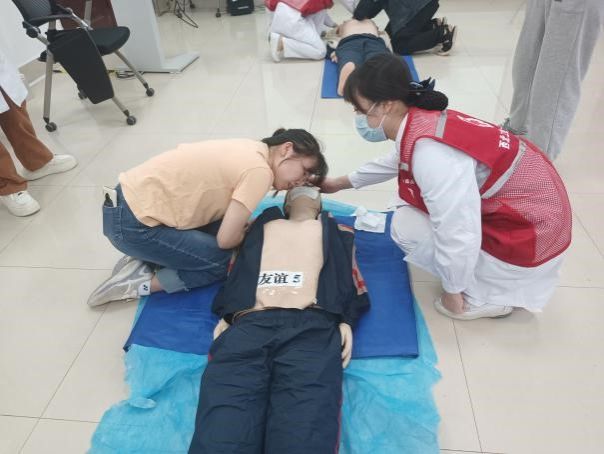 最后,参训师生依次使用模拟假人,亲身实践心肺复苏和AED的使用操作过程,使理论知识与技能实操有效结合,极大的提升了师生们对急救的认识。
