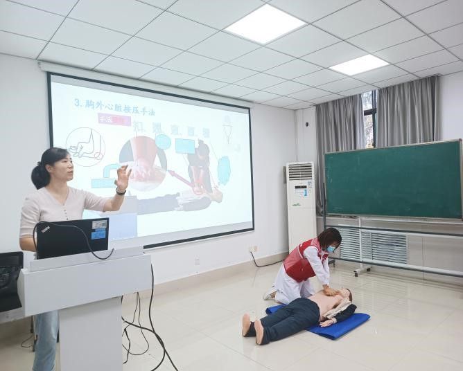 校医院郑莉莉院长详细介绍了校医院近年来的发展历程及各科室情况,并从校园实际案例出发,围绕心肺复苏、AED使用和海姆立克急救法展开全面细致的讲解。在培训现场,医师们为大家展示了胸外按压、人工呼吸等心肺复苏技术的手法和动作要点。