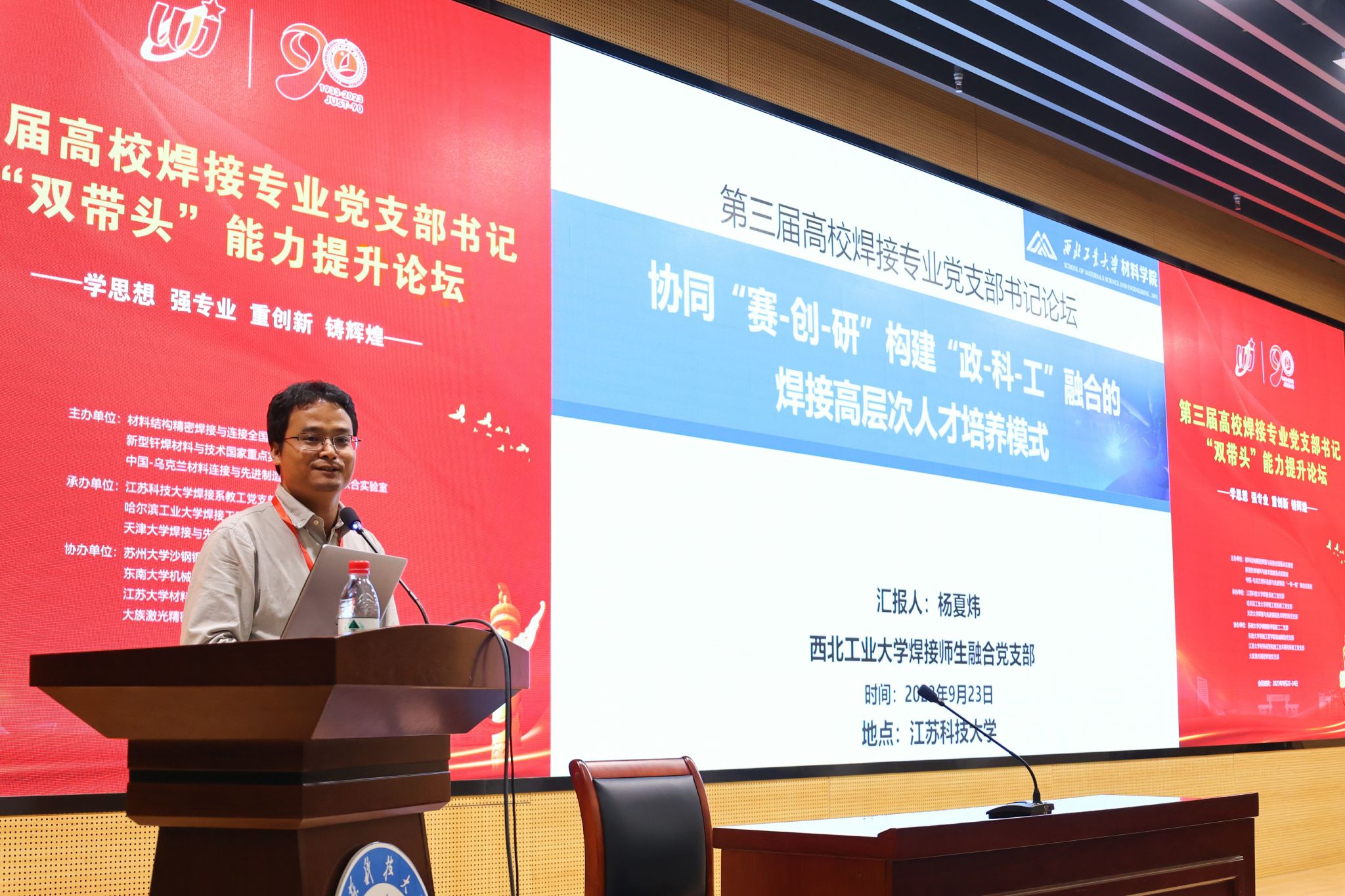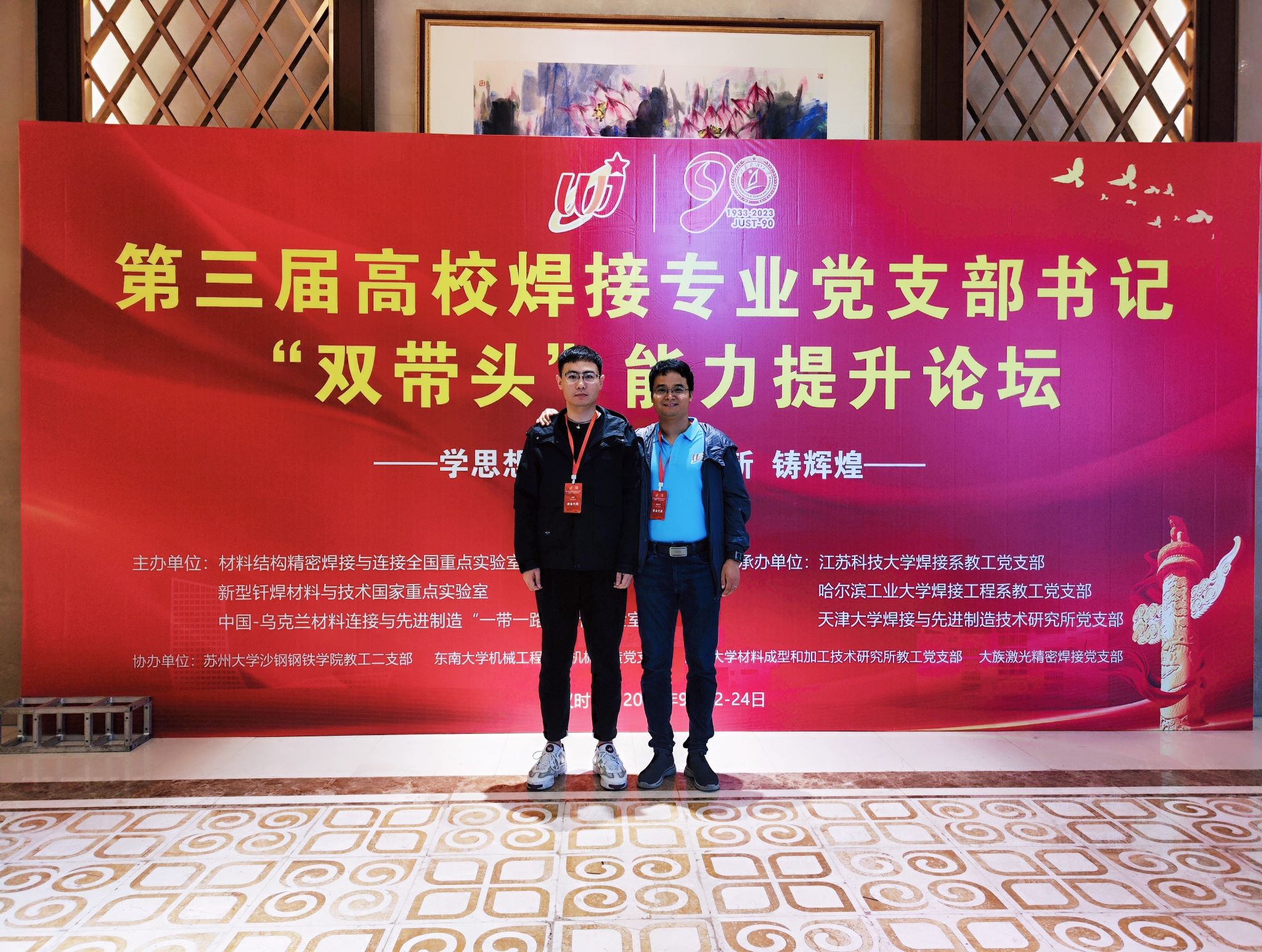 2023年9月22-24日,第三届高校焊接专业党支部书记“双带头”能力提升论坛 (以下简称“论坛”) 在江苏科技大学举行,共有来自全国66家高校、1家企业的焊接专业(方向)党支部书记、党员骨干等近100人参会。论坛由中国机械工程学会焊接分会指导,先进焊接与连接国家重点实验室、新型钎焊材料与技术国家重点实验室、中国-乌克兰材料连接与先进制造“一带一路”联合实验室共同主办,江苏科技大学焊接系教工党支部、哈尔滨工业大学焊接工程系教工党支部、天津大学焊接与先进制造技术研究所党支部承办。换妻
