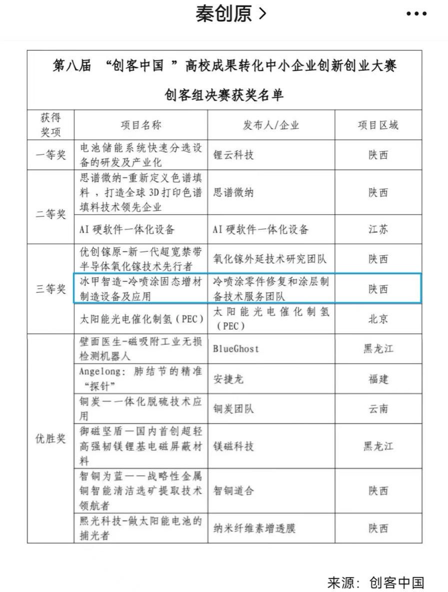 冷喷涂零件修复和涂层制备技术服务团队获该项赛事总决赛创客组三等奖。