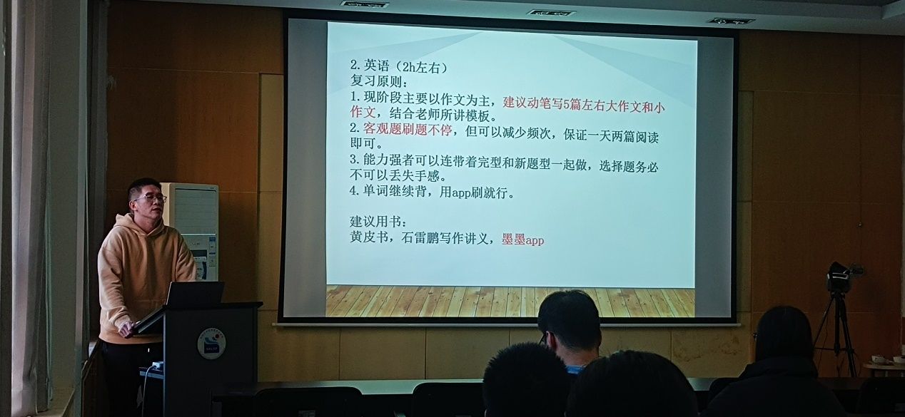 第三位闫智聪同学简洁明了的给大家介绍了在考试过程中各科目需要注意的关键点,同时为大家介绍了相关的一些复习资源,例如微信公众号和bilibili上的一些资源等,在轻松有趣的氛围下,用较少时间掌握了很多知识点干货。他提出在最后的做题冲刺时,一定要抓大放小,该拿到的分一定要拿到。同时,现阶段应充分利用碎片化时间,对当天的复习内容进行回顾和反思。最后指出,在最后一个月里,一定要调整好心态,锻炼好身体,保持自己的自信心,相信自己一定能行。