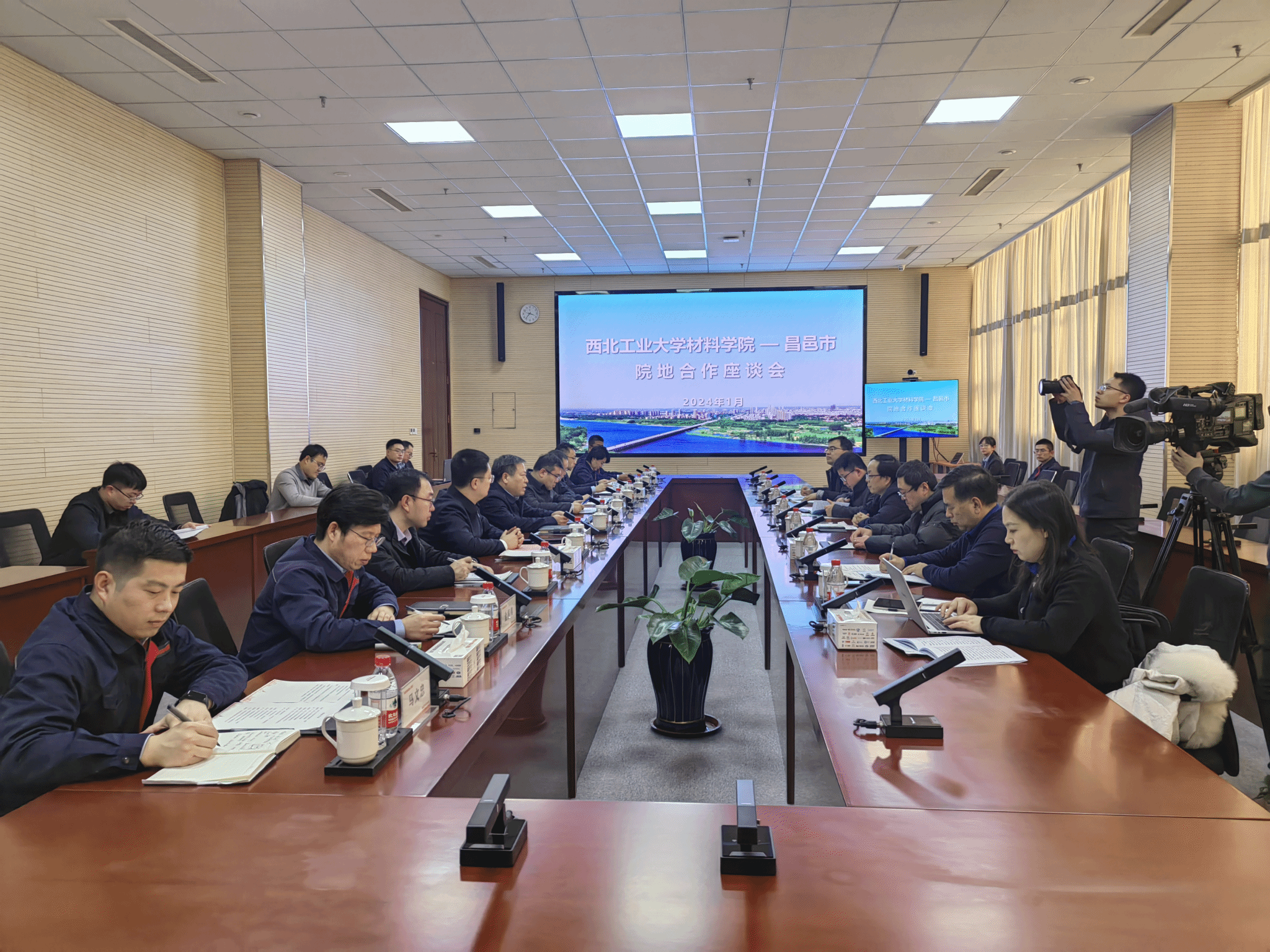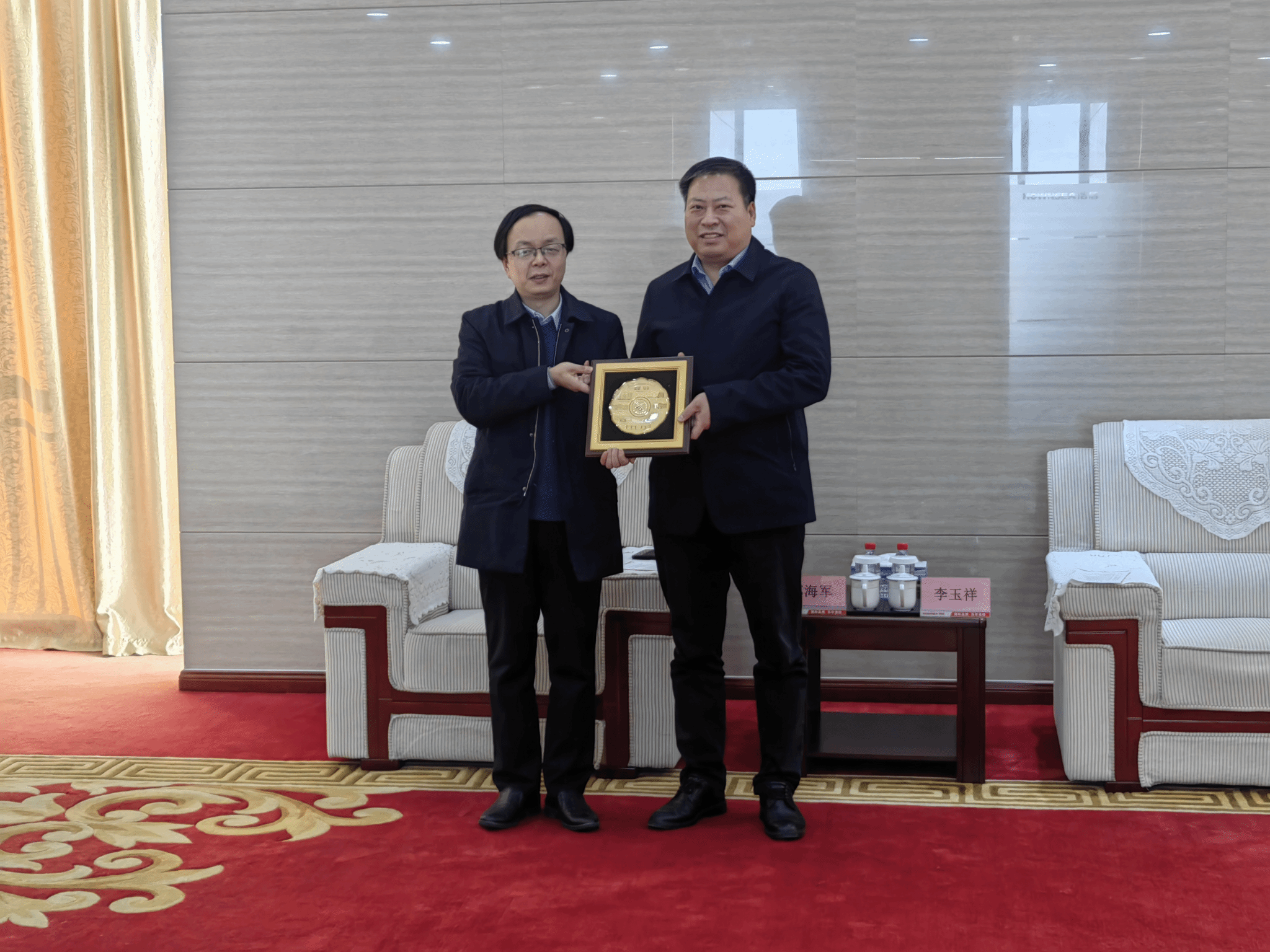 调研团一行首先看望了西工大校友、昌邑市委书记李玉祥并开展亲切座谈。李玉祥深情回顾在西工大求学的岁月,并认真询问学校发展的近况。苏海军一一回复校友关切并代表学院赠送校友纪念盘。