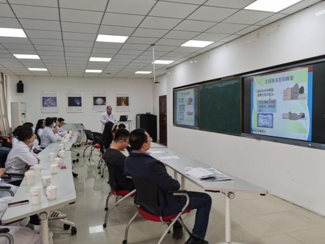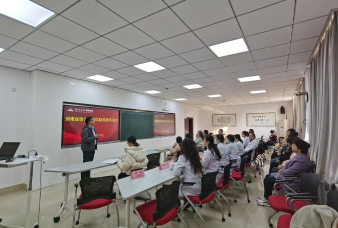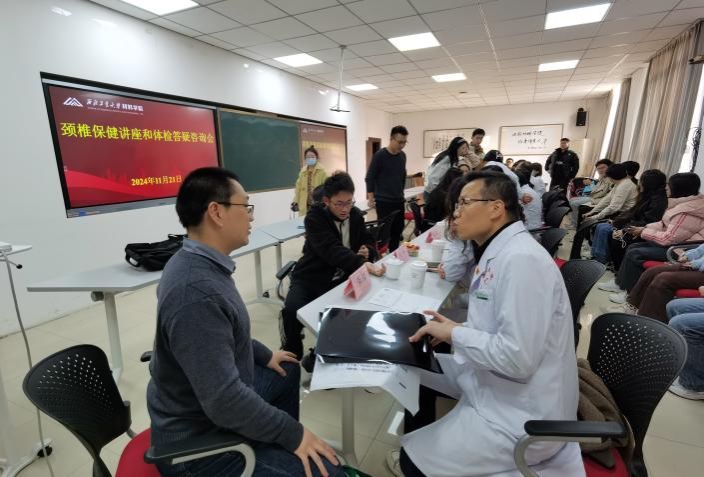与校医院联合举办颈椎健康讲座暨2024年教职工体检报告答疑咨询会。校医院院长助理田博、体检中心主任陈金华、中医理疗科康复治疗师王国强等9名医护人员及学院40余名师生参加。活动由学院分工会主席张勇主持,院长助理孙磊参加会议。