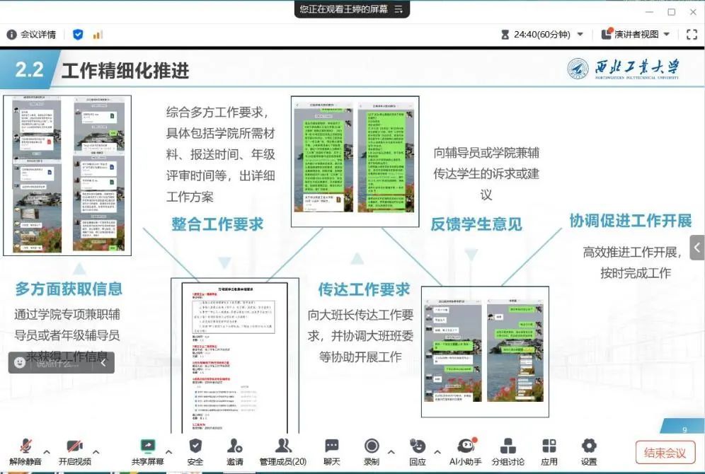 全体兼职辅导员依次答辩,围绕年级工作、学生党建团建、学风建设、心理健康、学生奖助、就业指导、安全教育、创新创业、迎新毕业等各自负责岗位,汇报工作思路、成效、问题及改进措施。