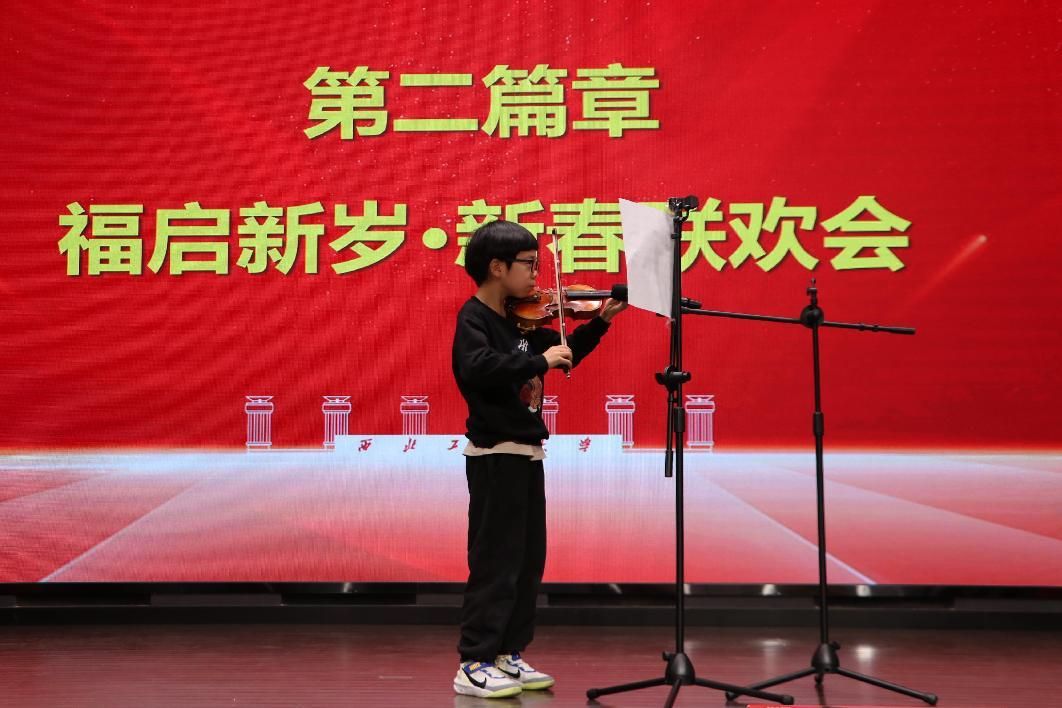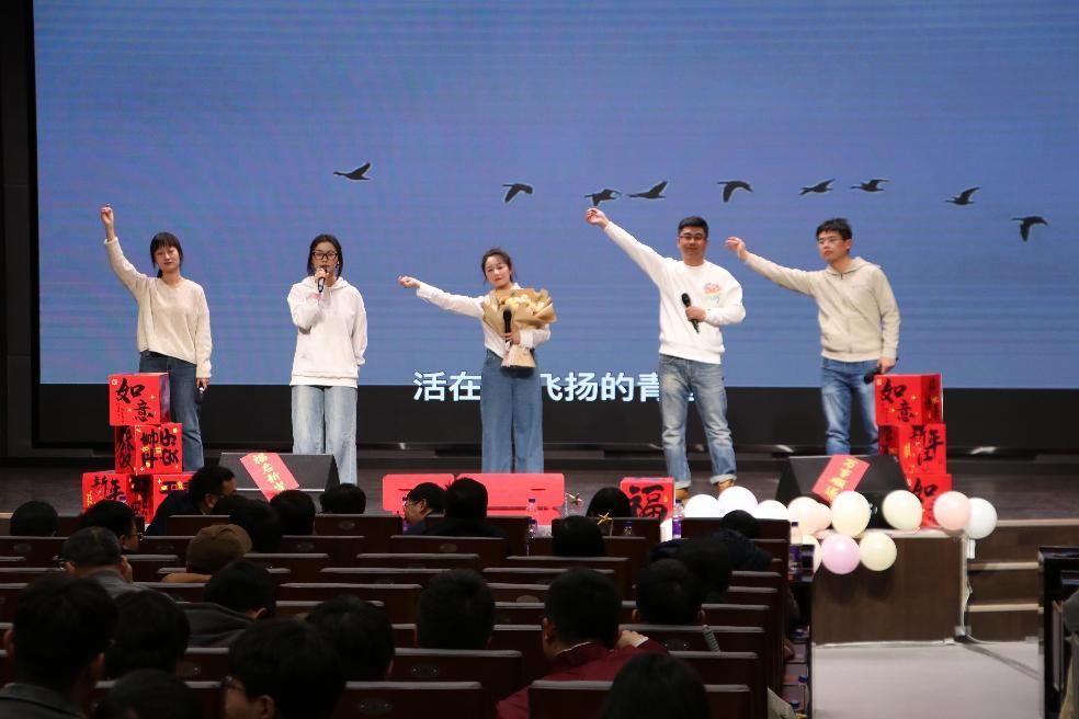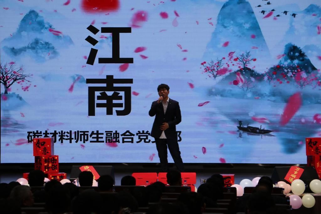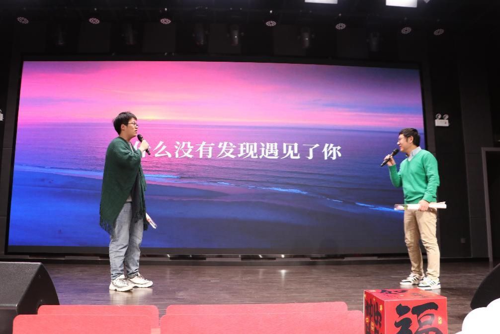 颁奖典礼结束后,新春联欢会拉开帷幕。曹晔洁、郑泽邦两位青年教师主持联欢会。各师生融合党支部联合各工会小组为全体师生献上了精彩纷呈的节目。