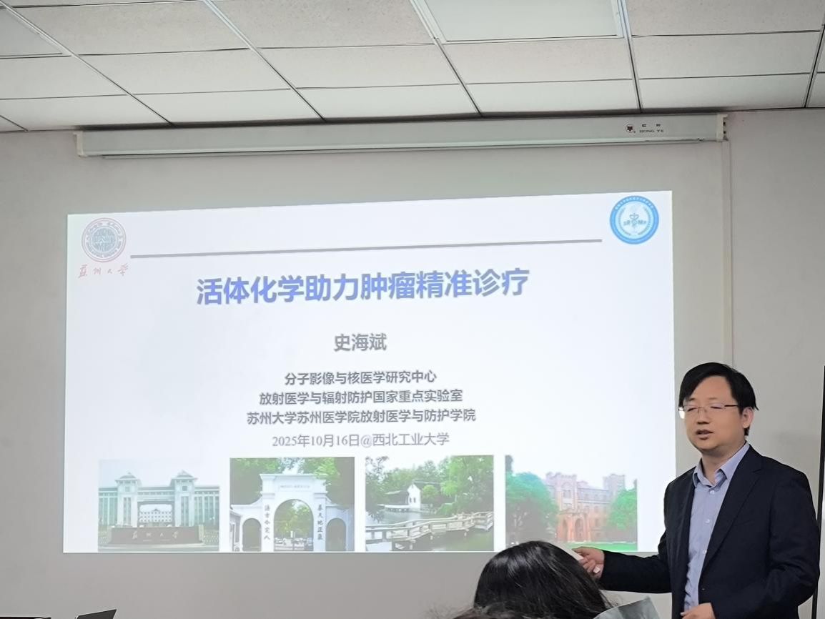 10月16日,苏州大学史海斌教授应邀做客学院领军讲堂,为广大师生作题为《活体化学助力肿瘤精准诊疗》的学术报告,尚利教授主持报告会。