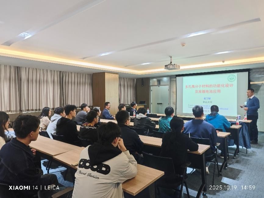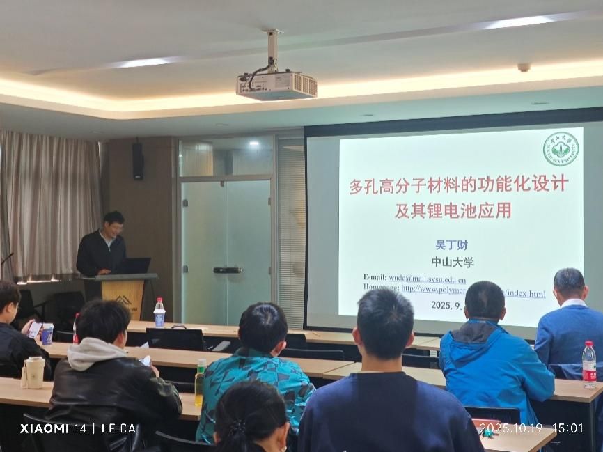 10月19日,国家杰出青年科学基金获得者、中山大学吴丁财教授为学院师生带来《多孔高分子材料的功能化设计及其锂电池应用》的学术报告,王洪强教授主持报告会。