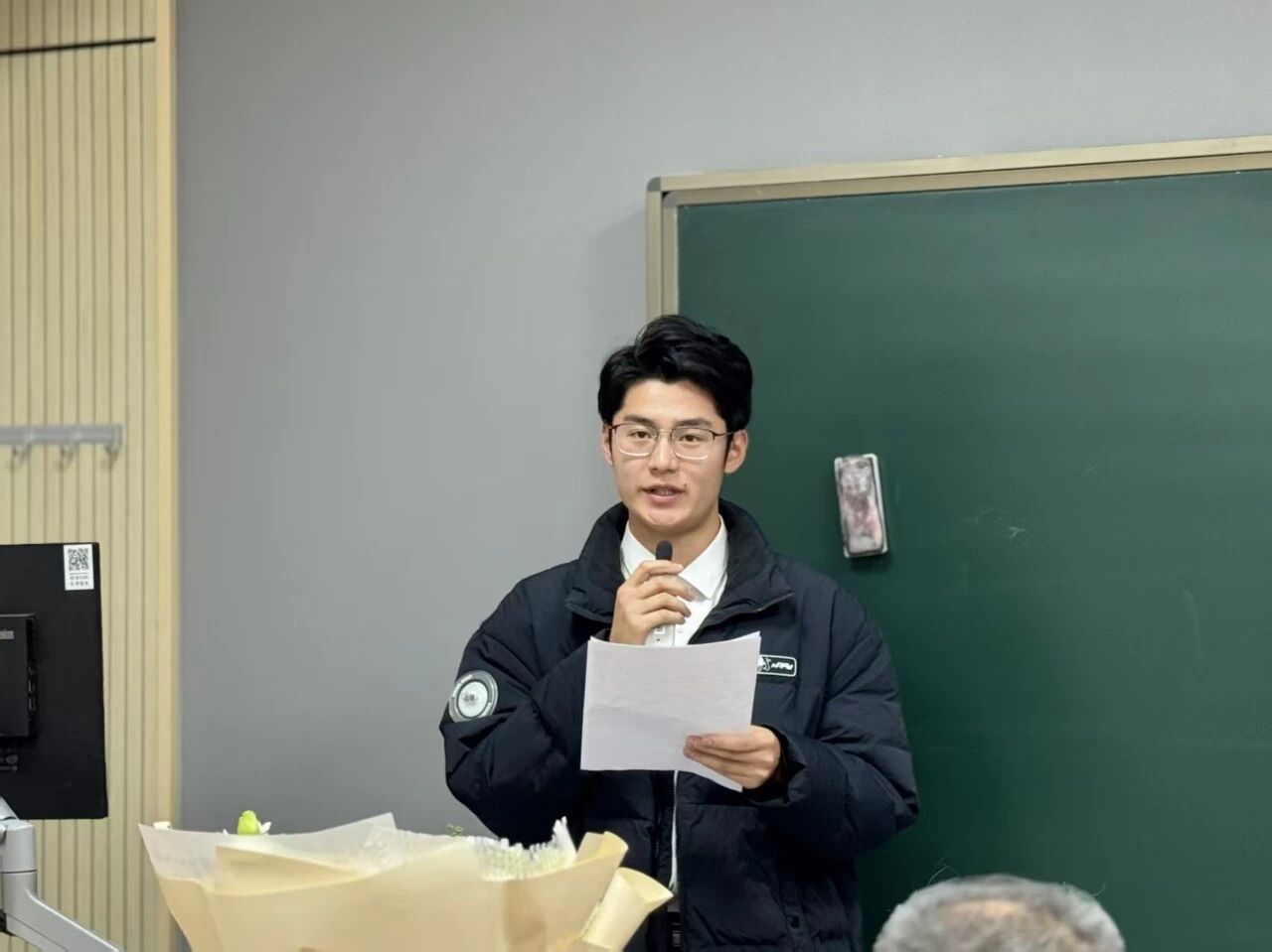 付前刚为李贺军院士颁发第二期铸剑班荣誉班主任聘书,新学员代表向院士献花。