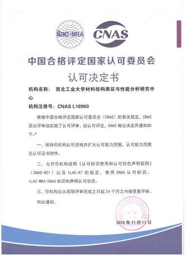 材料结构表征与性能分析研究中心(陕西省材料分析研究中心)正式通过中国合格评定国家认可委员会(CNAS)复评审,获颁认可决定书。中心不仅在原有基础上延续了国家认可资格,更实现了检测能力范围的扩容,印证了质量管理体系与技术能力持续对标国际标准,迈上新台阶。目前中心获认可的检测能力范围覆盖化学、机械等领域,包括碳硫、氧、氮、氢、室温拉伸、维氏硬度、微观形貌、固相线温度、微区元素能谱分析及比表面积检测项目和相关参数。