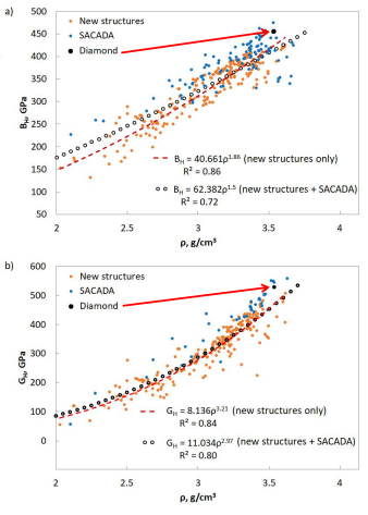 图3.四配位碳同素异形体的体积模量和剪切模量与密度的关系