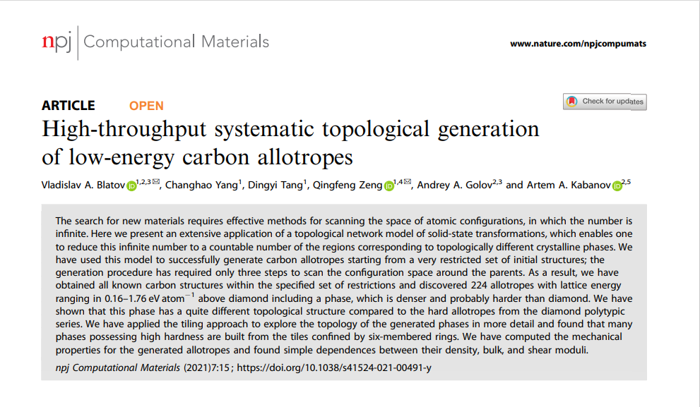 的曾庆丰副教授团队联合开发了一种新型高通量晶体构型空间拓扑搜索算法,能够从任意的材料初始结构出发,完成对具有海量原子排列组合的晶体构型空间的有效扫描筛选,从而发现新型材料结构。最新的研究成果发表于《npj Computational Materials》。(Vladislav A. Blatov*, Changhao Yang, Dingyi Tang, Qingfeng Zeng*, Andrey A. Golov & Artem A. Kabanov. High-throughput systematic topological generation of low-energy carbon allotropes. npj Computational Materials 2021, 7: 15.//www.nature.com/articles/s41524-021-00491-y,图1)。
