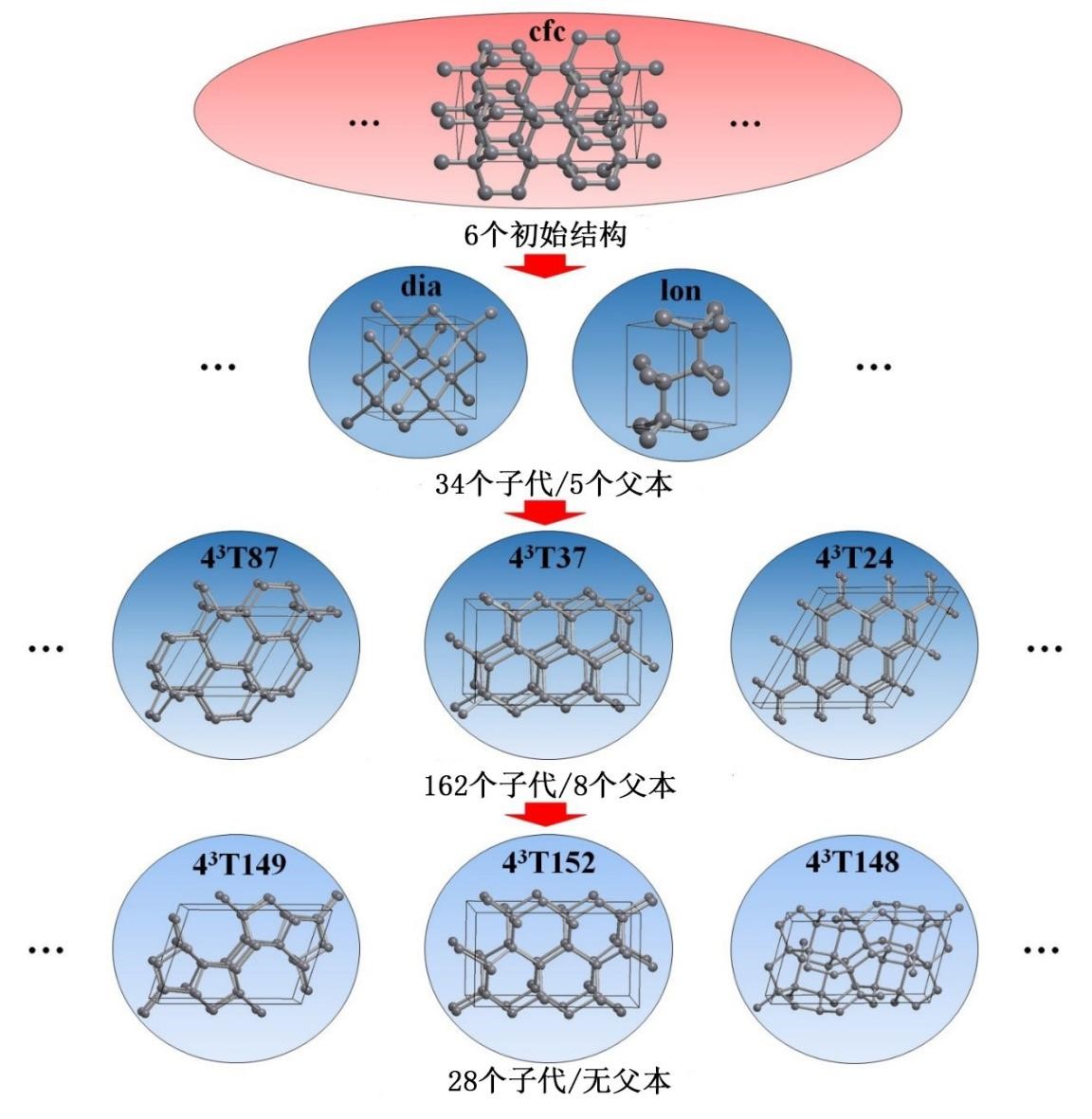 图4.碳材料拓扑结构转变与新发现硬度高于金刚石的碳同素异形体(43T16-CA)