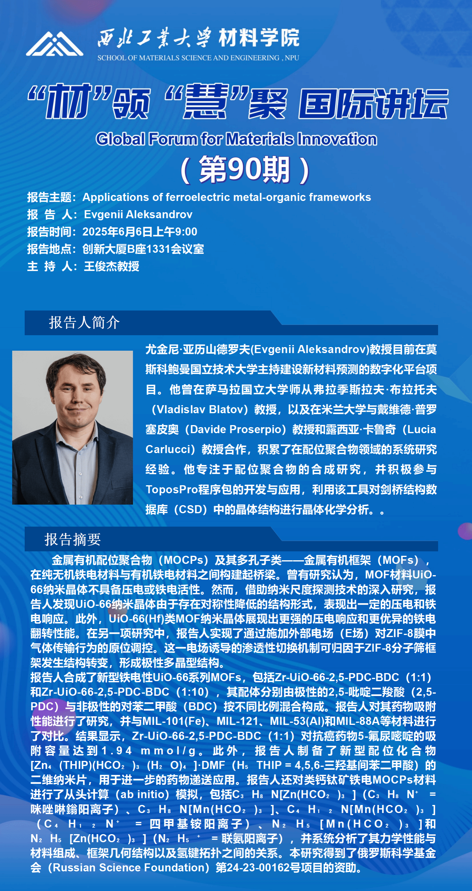 报告主题:Applications of ferroelectric metal-organic frameworks
