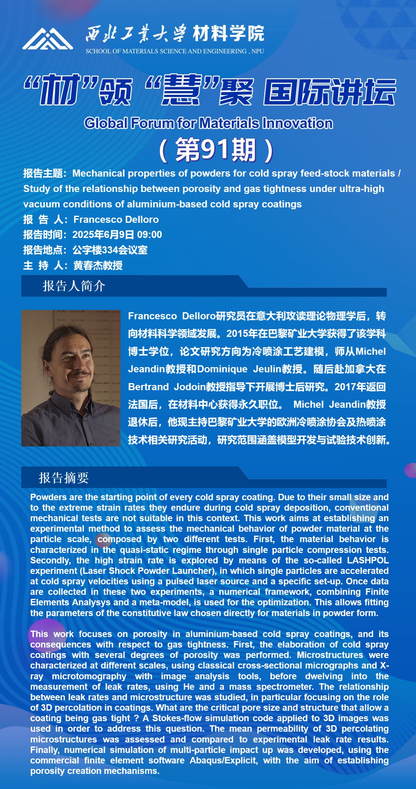 报告主题:Mechanical properties of powders for cold spray feed-stock materials / Study of the relationship between porosity and gas tightness under ultra-high vacuum conditions of aluminium-based cold spray coatings