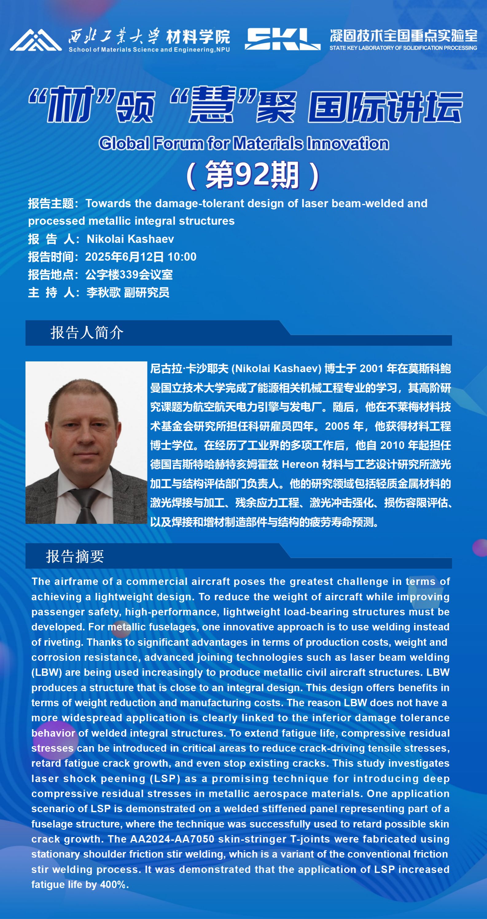 报告主题:Towards the damage-tolerant design of laser beam-welded and processed metallic integral structures