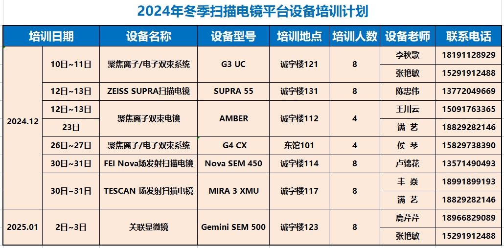 科教实践与材料分析创新中心(以下简称“中心”)计划开展2024年冬季扫描电镜平台设备培训,现面向校内开放报名,具体培训计划见下表。培训报名要求和注意事项安排如下: