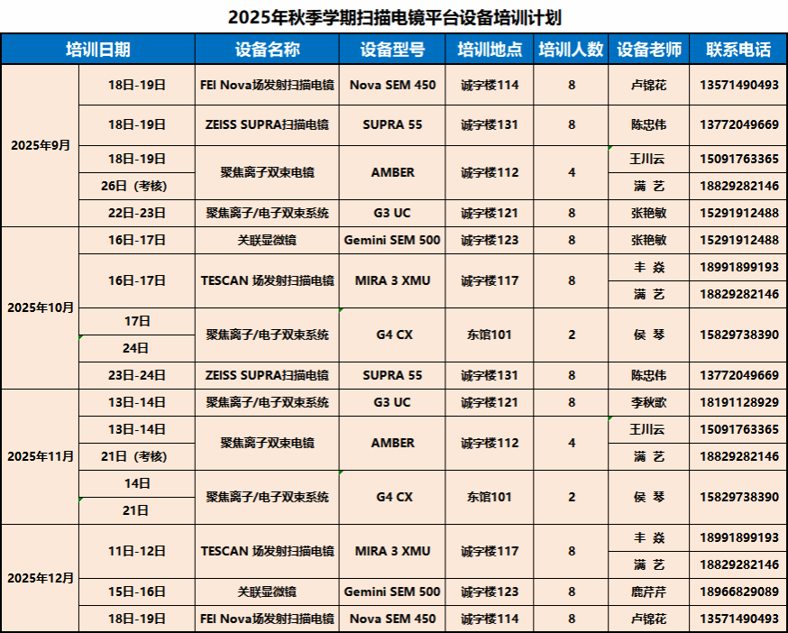 科教实践与材料分析创新中心(以下简称“中心”)计划开展2025年秋季学期扫描电镜平台设备培训,现面向校内开放报名,具体培训计划见下表。培训报名要求和注意事项安排如下: