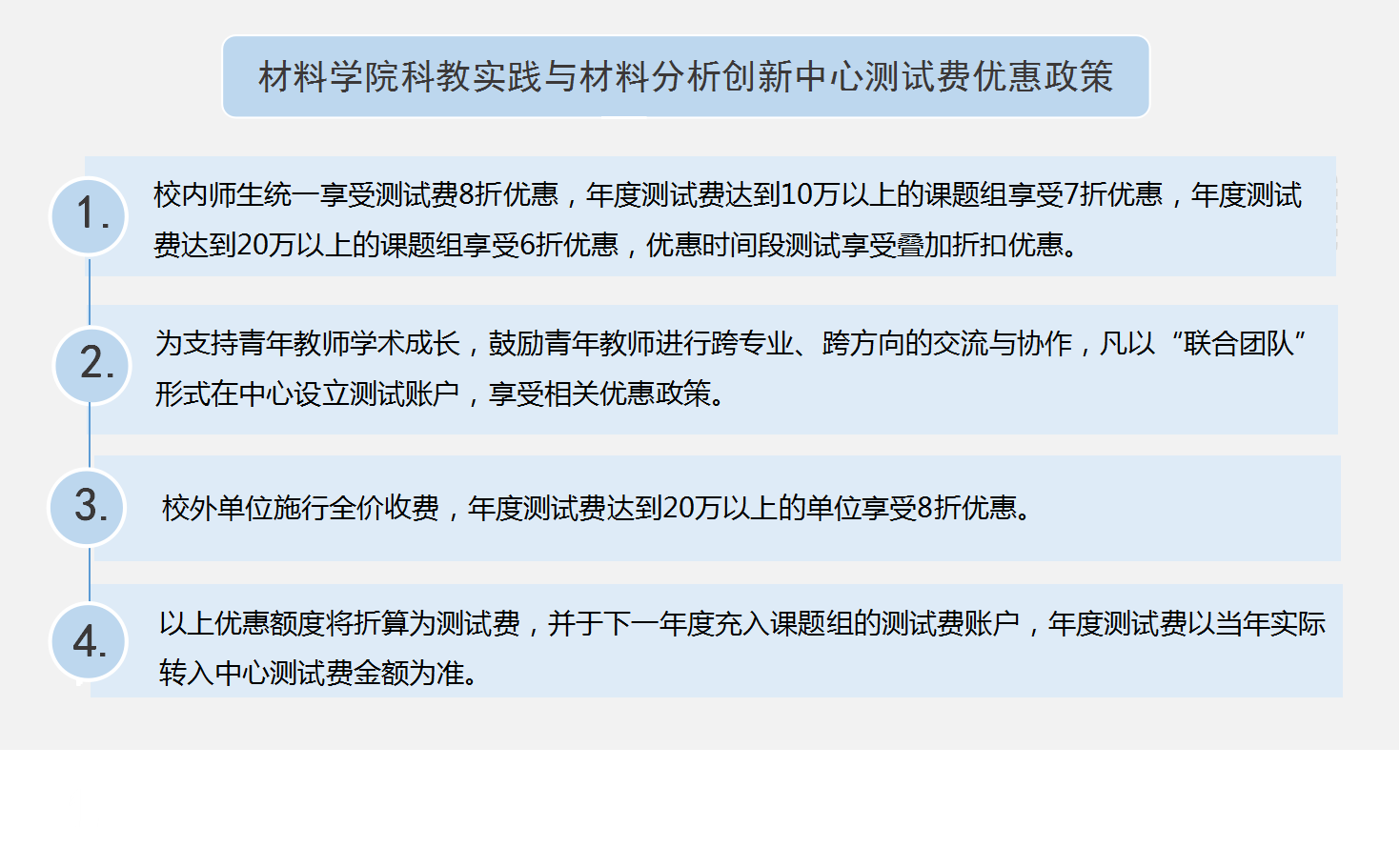 科教实践与材料分析创新中心(陕西省材料分析研究中心)制定并实施测试费优惠政策。经2021年度核算,共有119个课题组享受测试费优惠奖励,总发放奖励金额198.6万元。其中10个课题组享受六折优惠,最高奖励金额28.6万元;10个课题组享受七折优惠,最高奖励金额4.8万元。